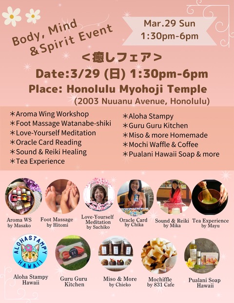 ホノルル妙法寺で心と体を優しく整える特別なイベントを開催します。日本のお茶会、オラクル・リーディング、足ツボマッサージ、サウンドヒーリング、アロマクラフトの体験型ブース、もちワッフル、フルーツサンド、手作り味噌や麹、ペットの肖像、ハンドメイド石鹸やスキンケアなどショッピングも楽しめるイベントです。皆様のお越しをお待ちしております。