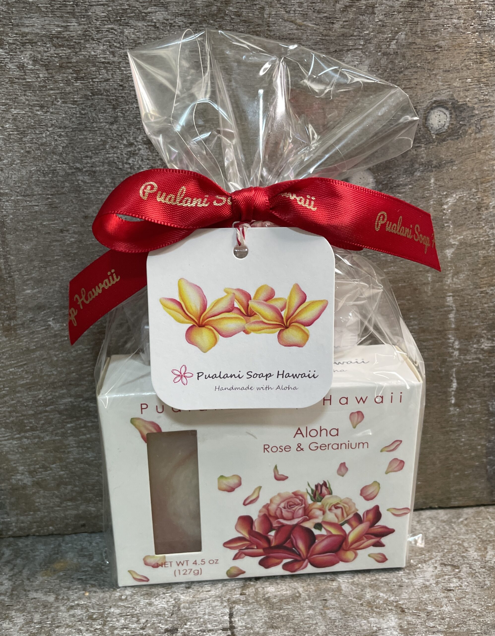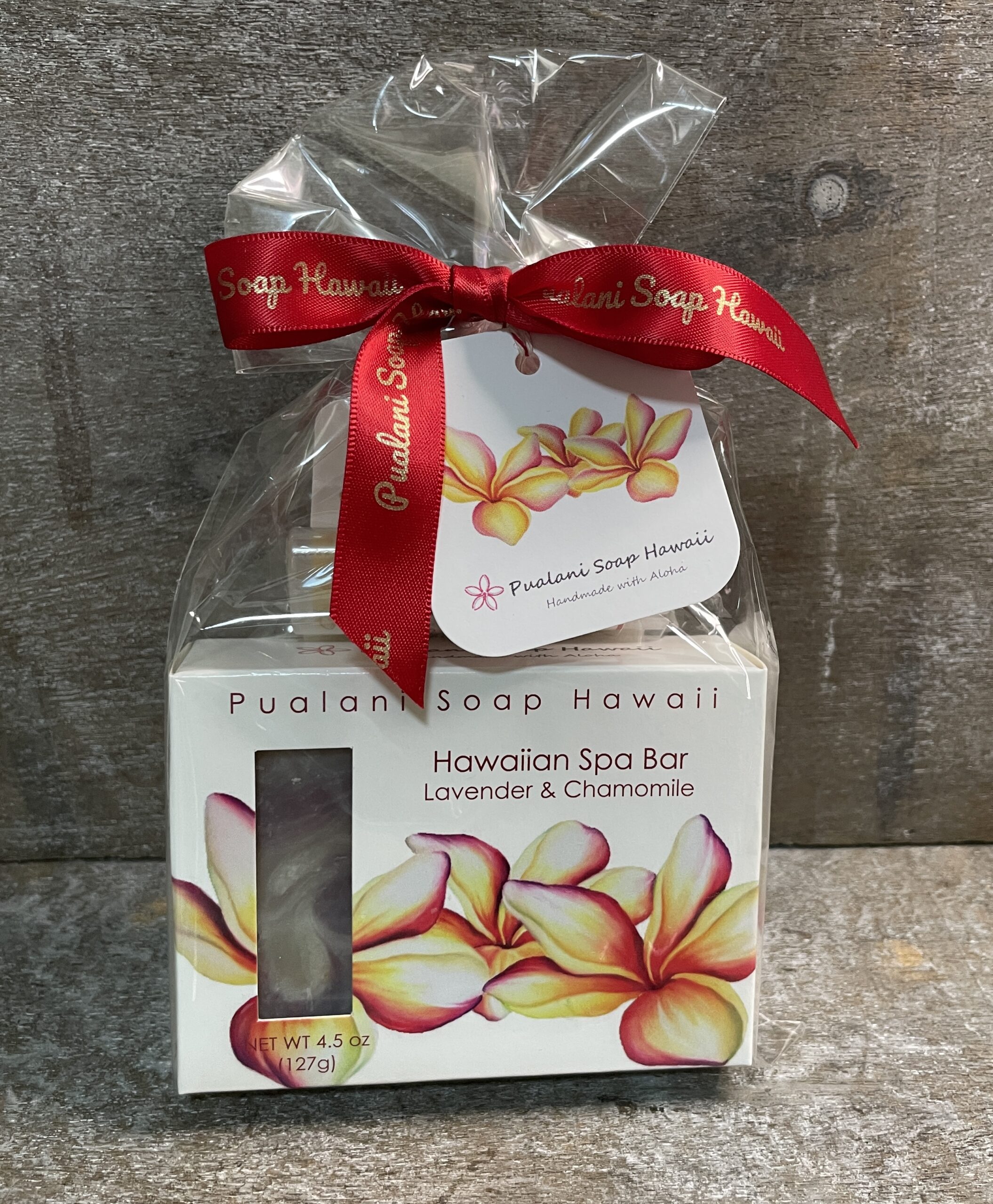 Pure olive oil, Coconut oil, Palm oil, Castor oil, Aloe butter, Hawaiian Kukui Nut oil, Organic and natural jojoba oil, Hawaiian solar charged purified water, Lye, Pure essential oils (varies), Kona deep ocean salt, Pure Hawaiian honey, Grapefruit seed extract, and Aloha