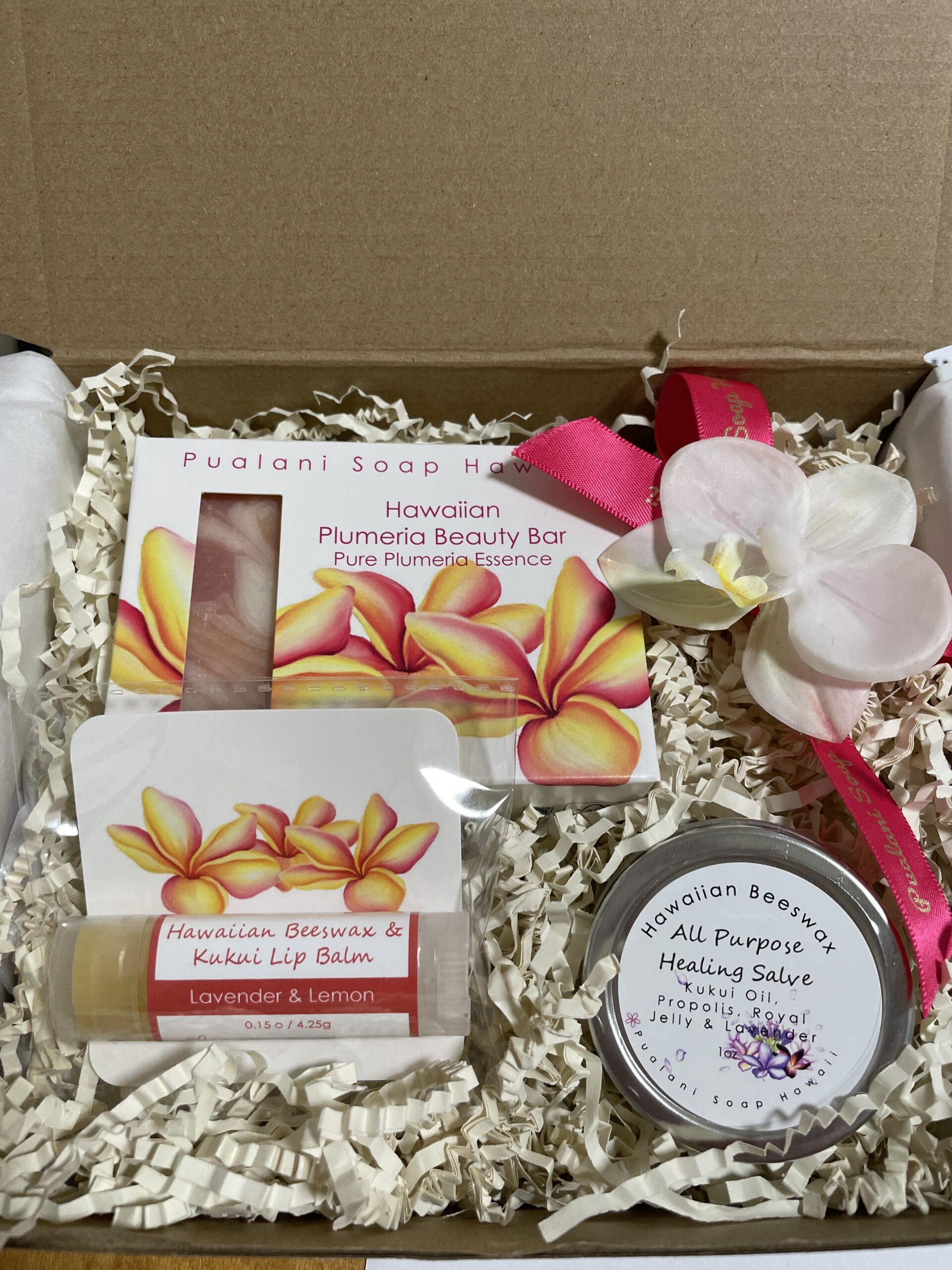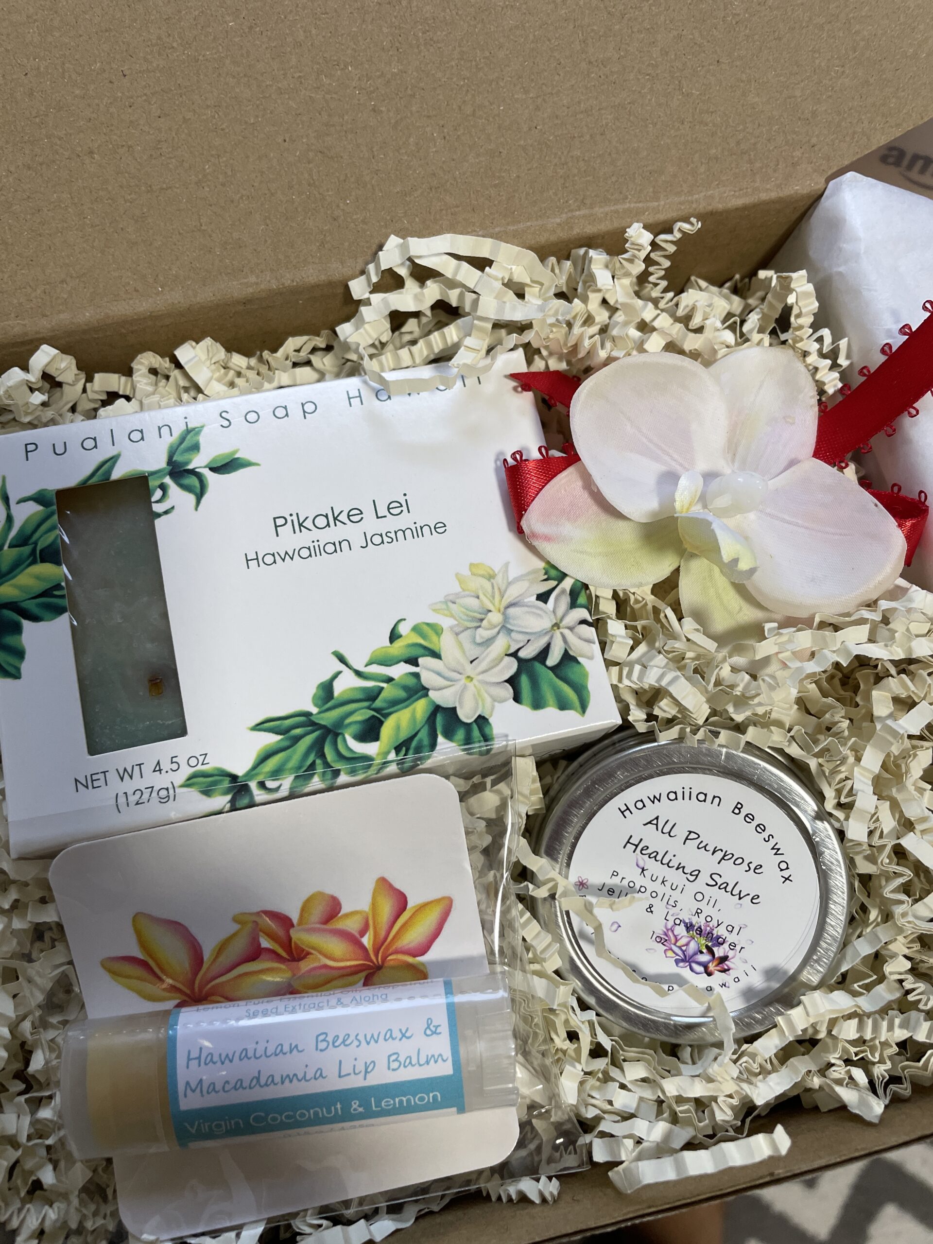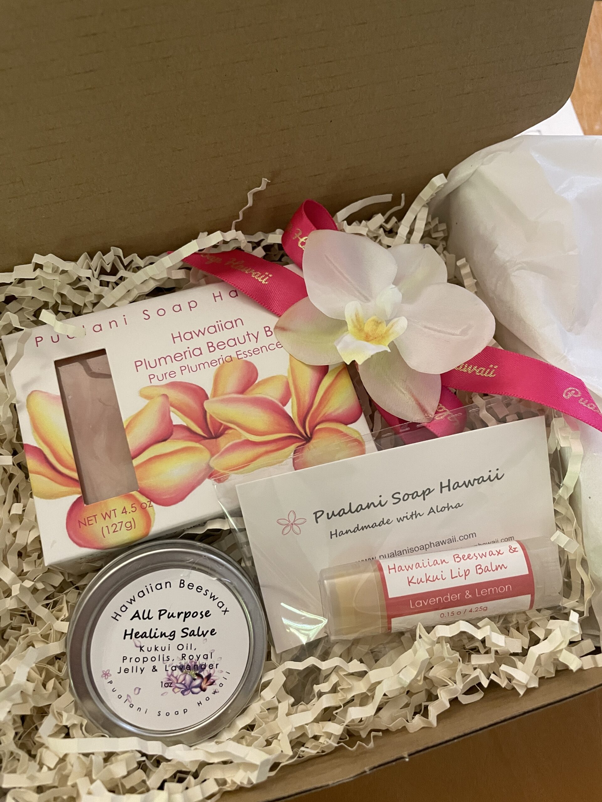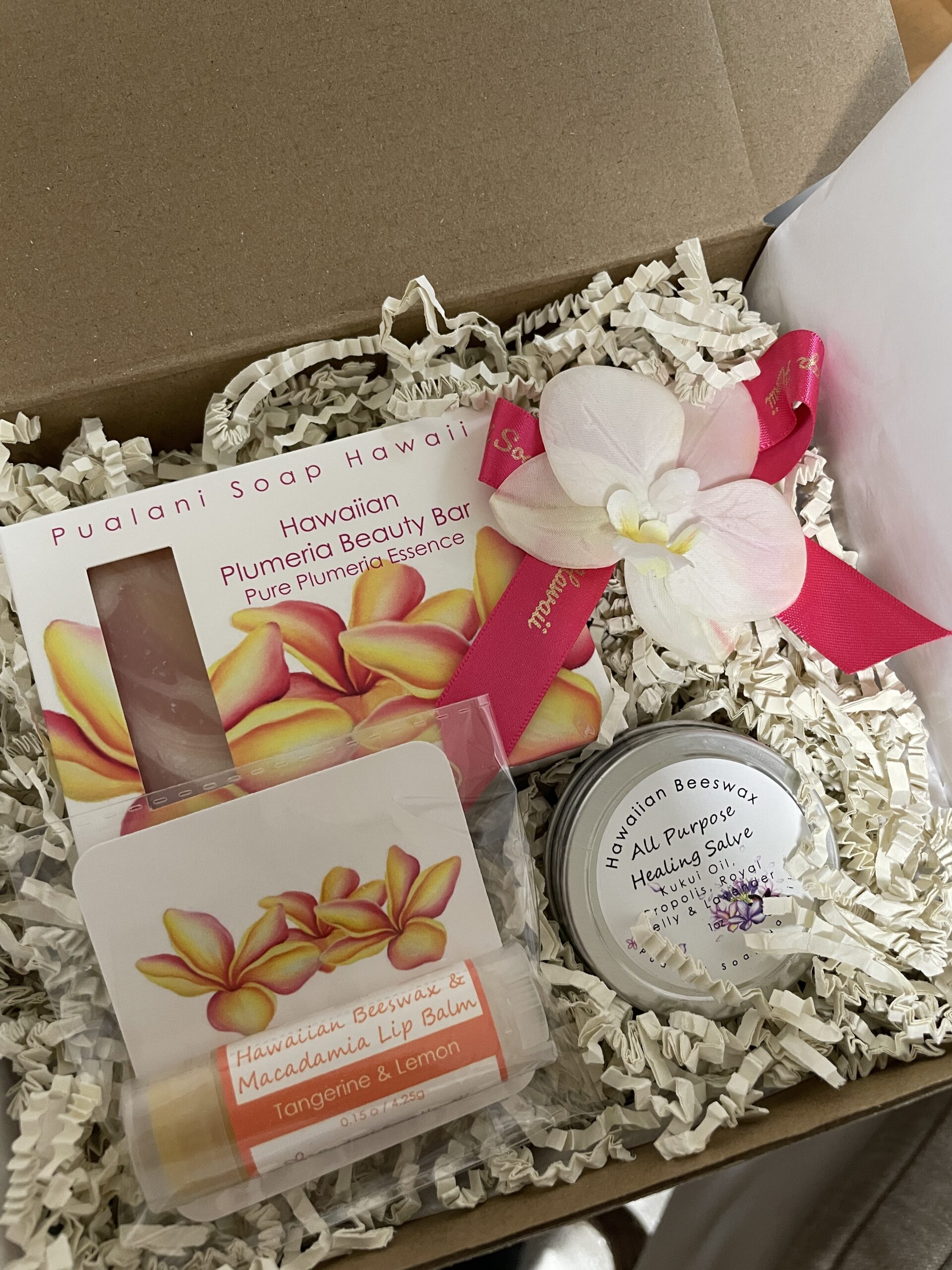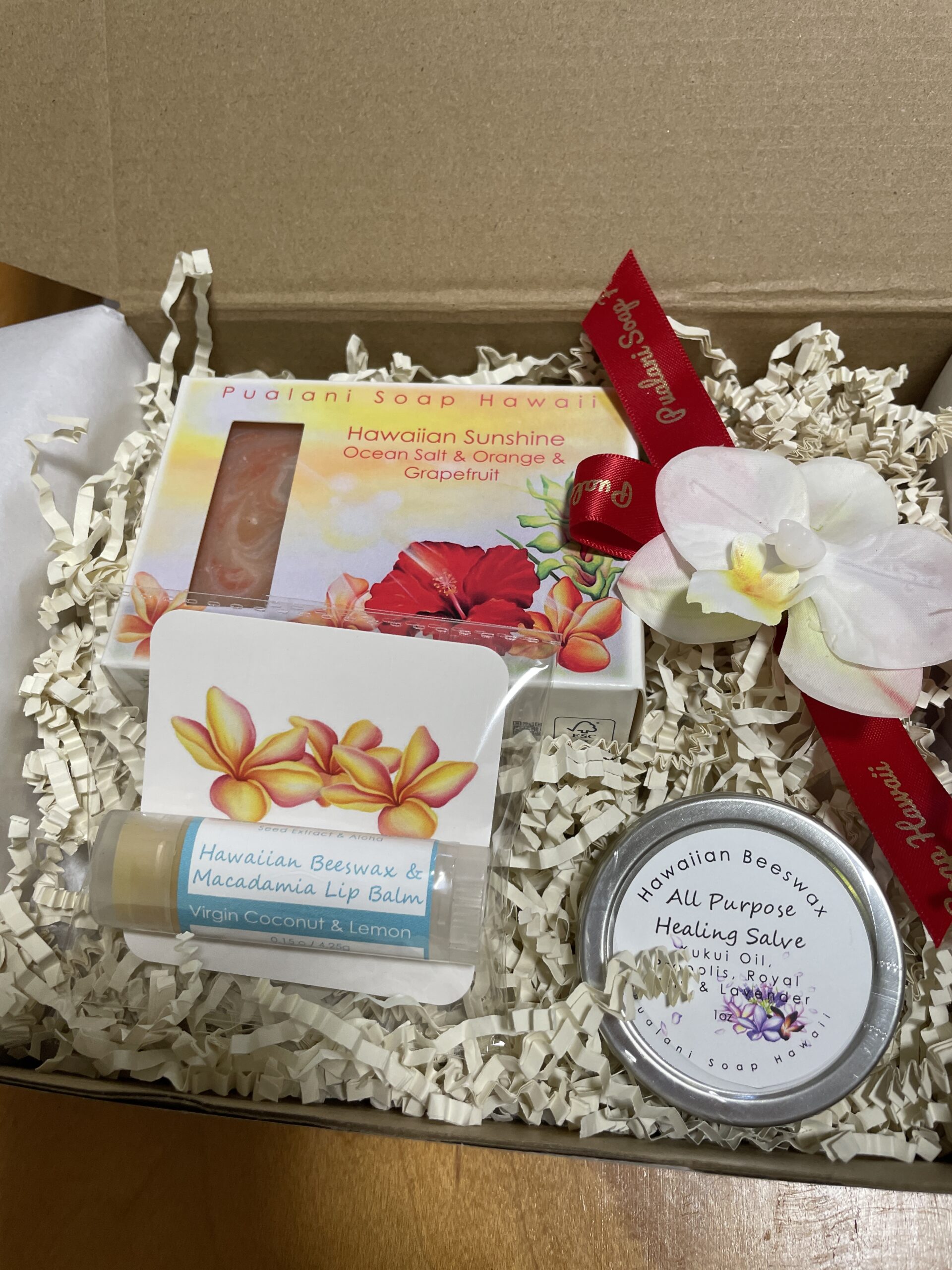 It is the perfect gift for many occasions. Good for Housewarming, Welcome gift, Teacher’s gift, Birthdays, Mother’s Day and Holidays. Create your own set by choosing your favorite Soap, Lip Balm, and Hawaiian Beeswax Salves.